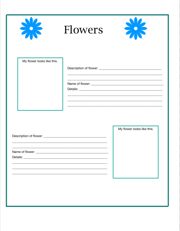 Essentially, notebooking is learning about a topic and then writing about it by means of a journal (notebook) page. It also includes some type of picture that is the focus of what is being studied. This can either be an image that is already on the page, or a space provided that the student can draw their own picture (or words that can be decorated). Download Flower Notebook Page.