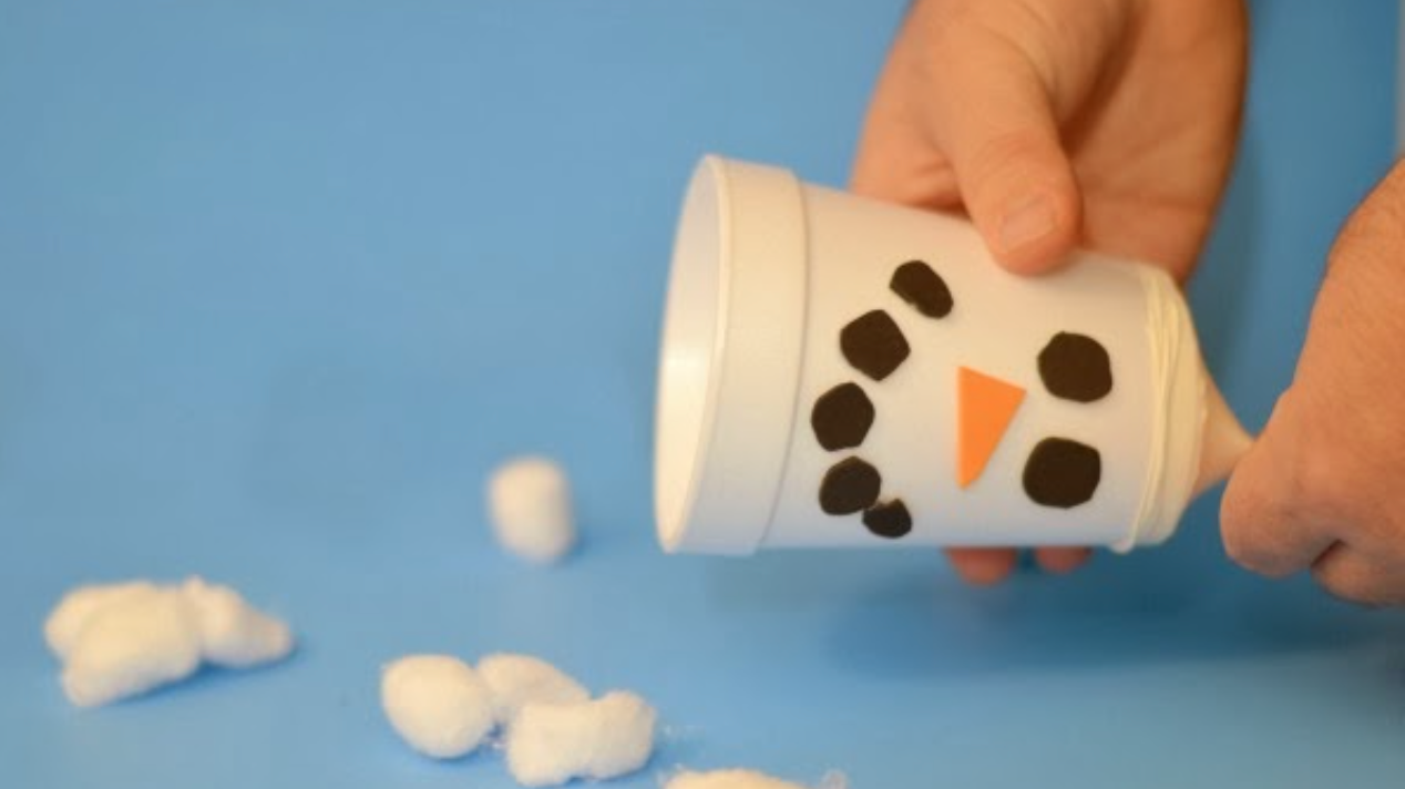 Snow shooters- With a bag of mini Marshmallows, some 9″ balloons, and disposable cups, you can create a really fun game that will keep your kiddo(s) and you moving. Cut off the bottom part of the balloon and place the rest of the balloon over the top of a disposable cup. This is your “shooter”. Add some marshmallows into the cup, pull back on the balloon and let go! The marshmallows will come flying out! You can have fun with having an indoor “snowball fight” and racing around to retrieve your ammo.
