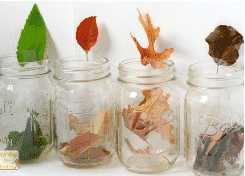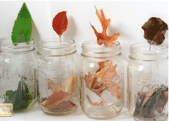 Take a rock or smooth, rounded object and grind up the leaf pieces. Place the cut-up leaves into mason jars or small glasses, putting the different colored leaves each in their own jar or glass.