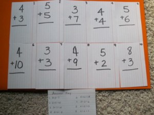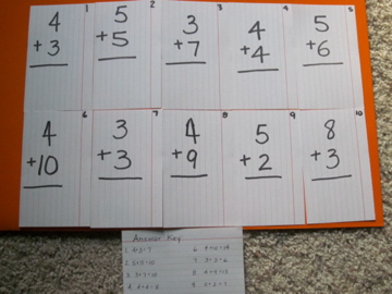 Write a small number on the problem side in the right hand corner beginning from the problem on the left hand side and going to the right and so on until you have numbered each card. The player may put the cards with the math problem facing up without your help, using the numbers in the right-hand corner as a guide to do so.